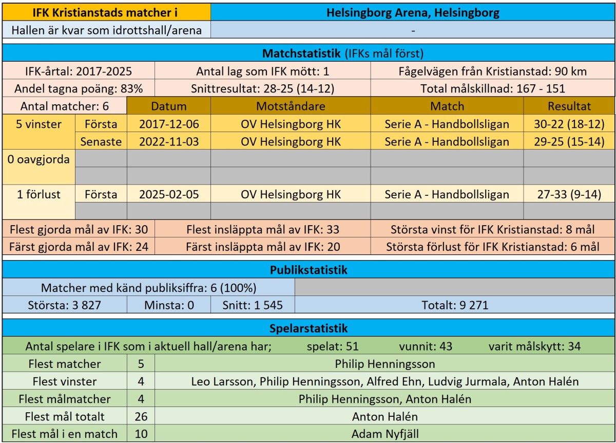 Tredje matchen mot OV och tredje hallen. Efter att spelat ATG Svenska Cupen i två klassiska idrottshallar tar vi steget in Helsingborg Arena invigd 2012. Statistik totalt i hallen, och resultat de 10 senaste matcherna.