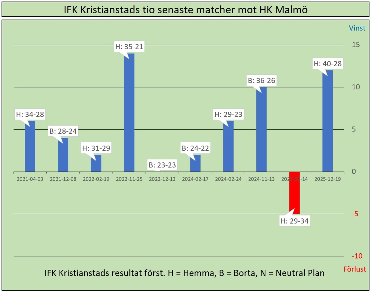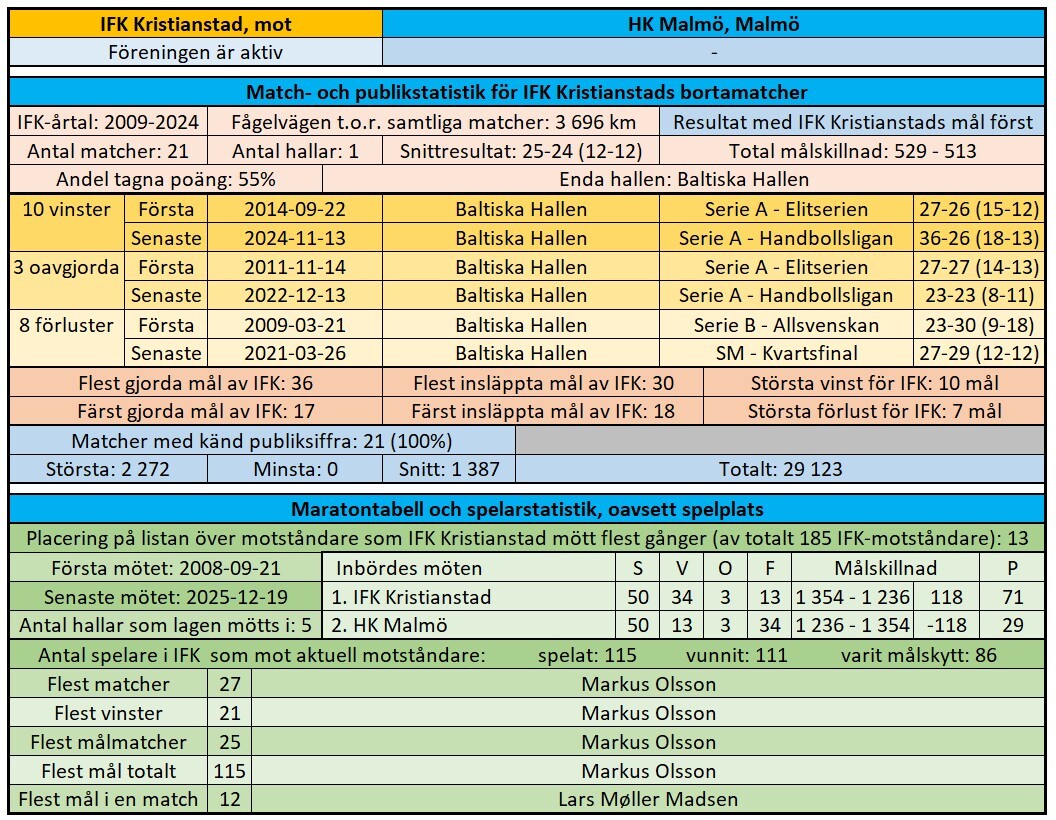 HK Malmö är en relativt ung förening, men vi har redan hunnits möta 50 gånger, varav 21 på bortaplan (neutral plan ej inräknad). På de 10 senaste matcherna har vi ett rejält övertag.