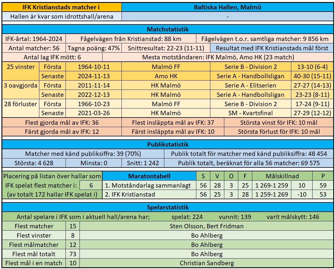 I Baltiska Hallen som vi invigde 1964 har vi spelat 56 matcher genom åren. Vi har mött sex olika lag där, men numera är det enbart HK Malmö.