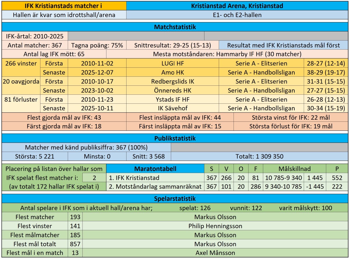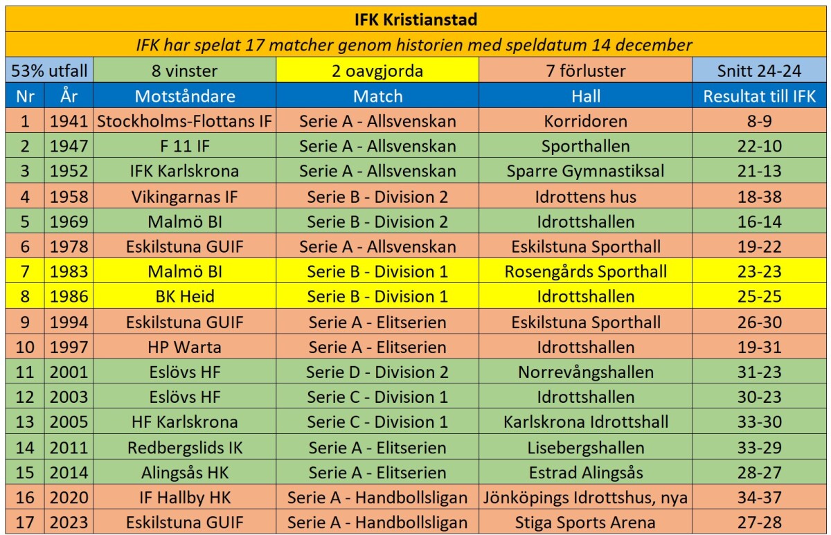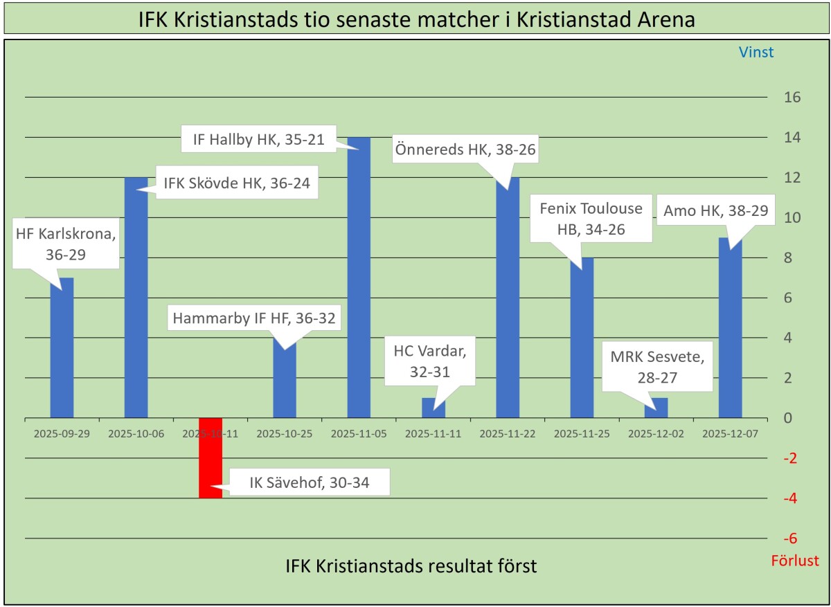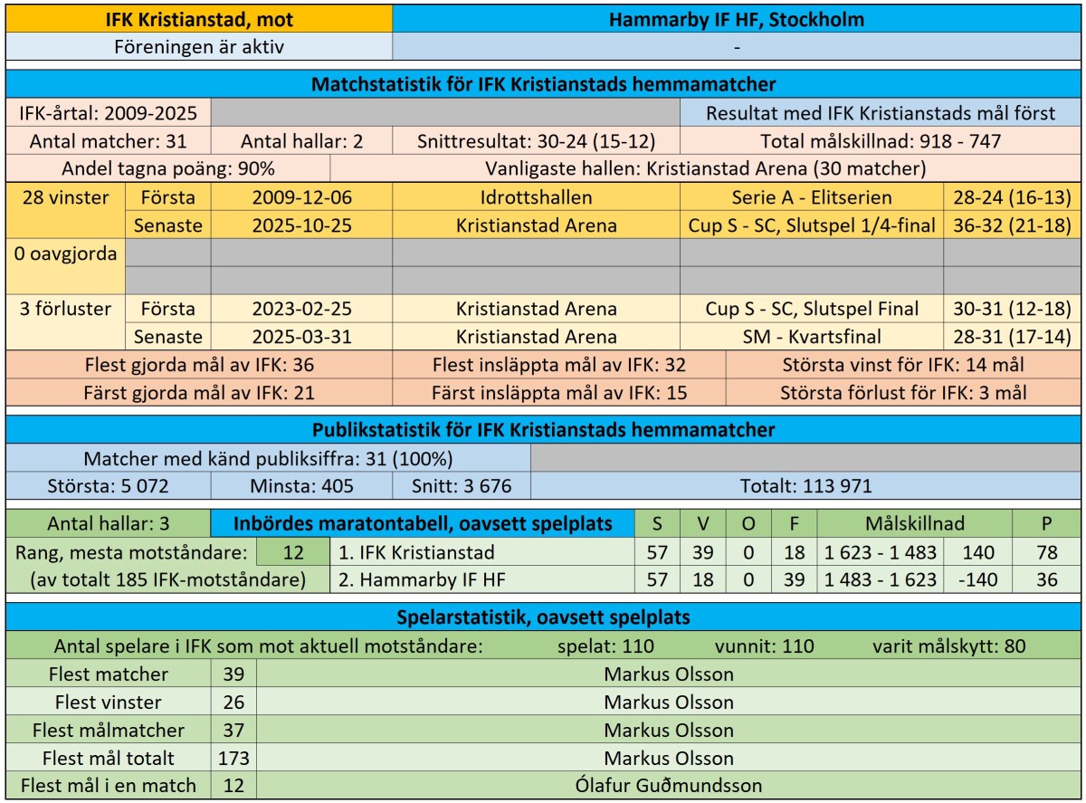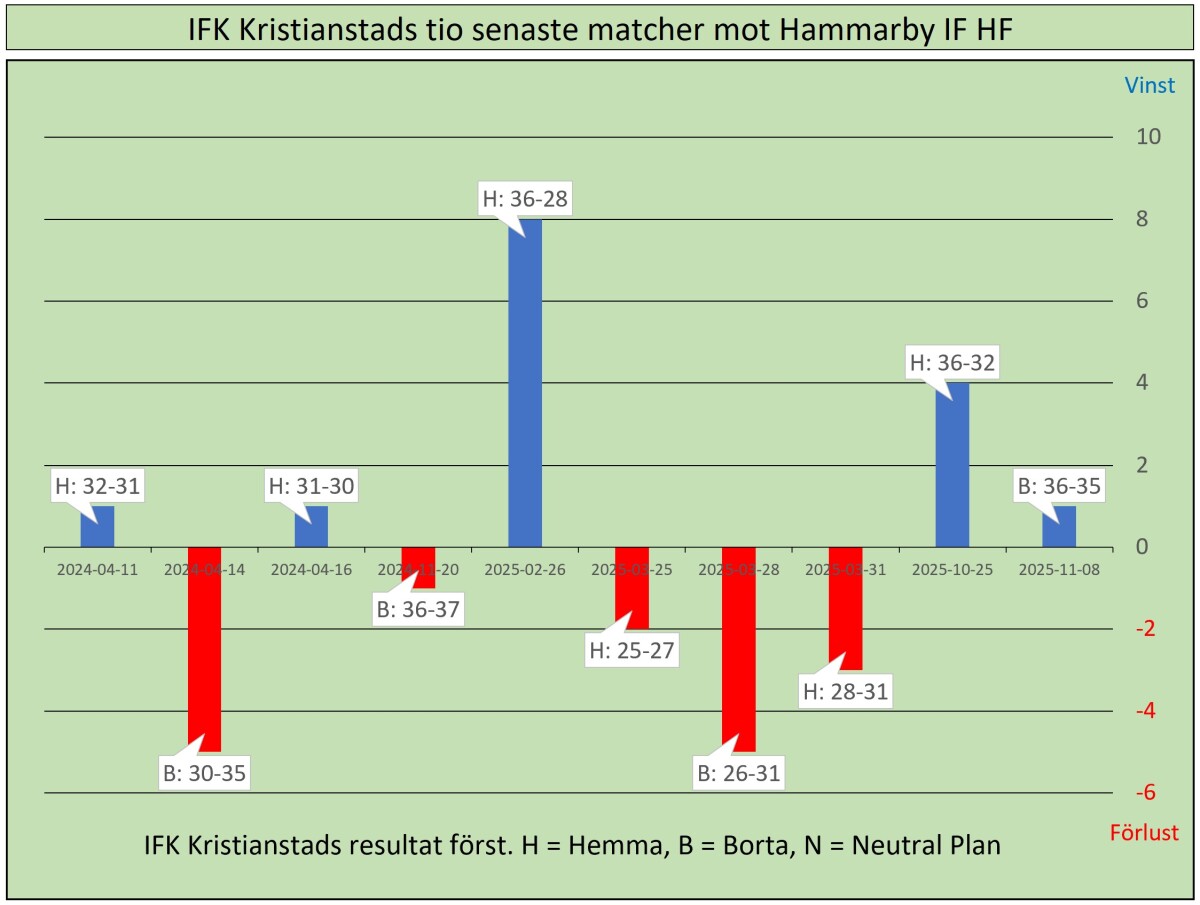 Det blir Hammarbys match nr 32 i Kristianstad. Utöver alla matcher i Arenan gjorde de även ett besök i Idrottshallen 2009. I våra tio senaste inbördes möten står det fem lika i antal vinster.