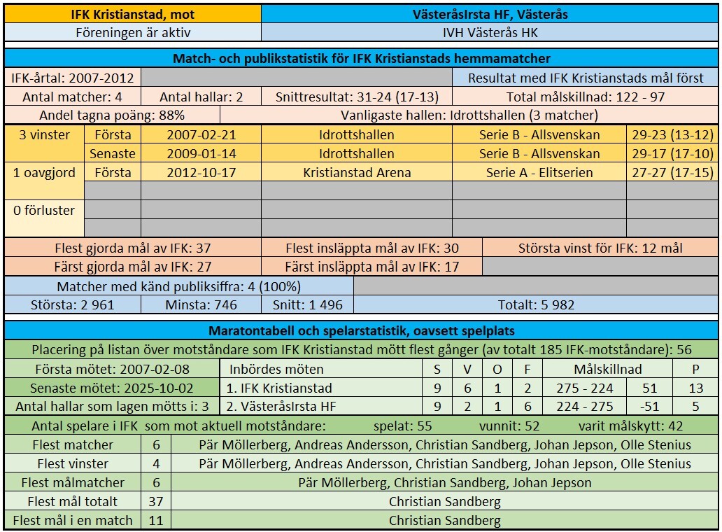 Det har genom åren varit lite olika sammanslagningar och delningar på handbollsklubbarna i Västerås och Irsta. Nuvarande förening har vi hittills mött fyra gånger på hemmaplan. På de totalt 9 matcherna har vi ett rejält övertag.