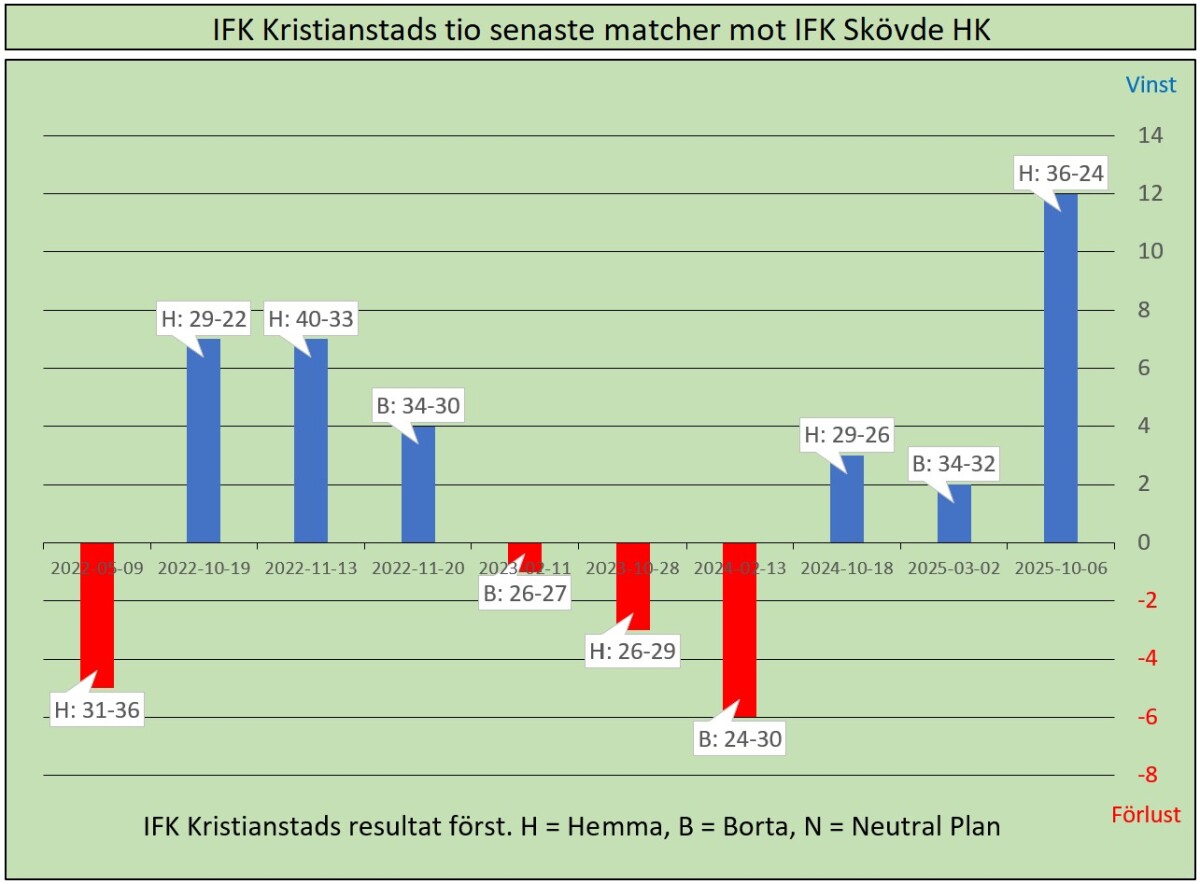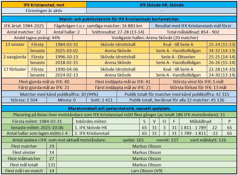 IFK Skövde är det enda lag som aldrig trillat ur den högsta serien, de gick upp i den nystartade Elitserien hösten 1990, och har stannat kvar där sedan dess. Det blir vårt 33:möte i Skövde och 66:e totalt. I inbördes möten är det helt jämt mellan oss, där Skövde leder på 22 måls bättre målskillnad. Det är även jämnt i våra 10 senaste möten, där vi har 6 segrar mot Skövdes 4.