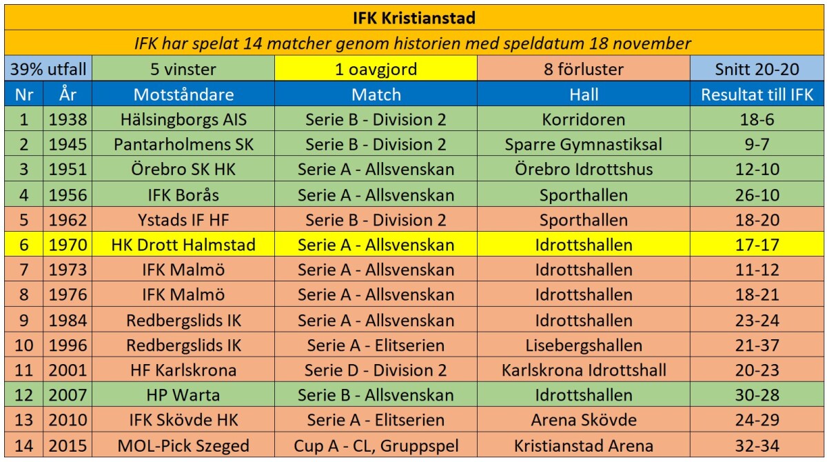 Vi har spelat 14 matcher den 18 november genom historien. Det började bra med fyra raka vinster 1938-1956, men därefter har det bara blivit en vinst, 2007, på 10 matcher.