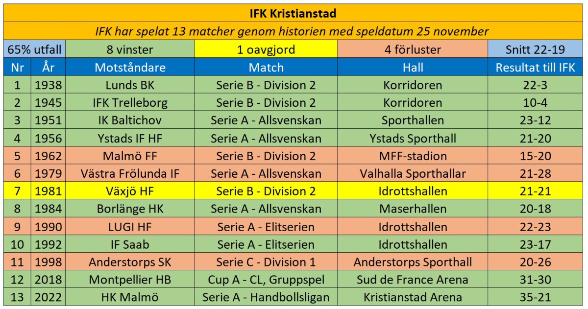 Vi har spelat 13 matcher den 25 november genom historien sedan 1938, då mot Lunds BK.