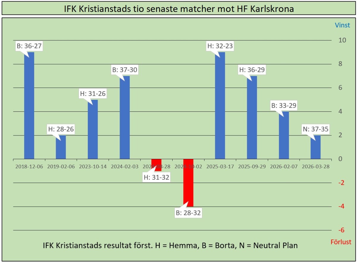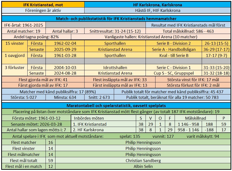 Det blir HF Karlskrona 20:e match mot IFK i Kristianstad. Av de 10 senaste mötena totalt har vi vunnit 8.