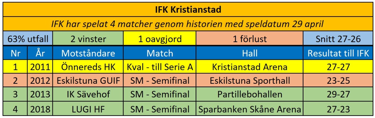 På dagens datum 29 april har vi spelat fyra matcher genom åren.